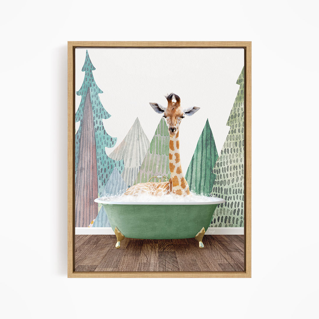A giraffe is sitting in a green bathtub, surrounded by a forest-themed background with trees and a pine tree.