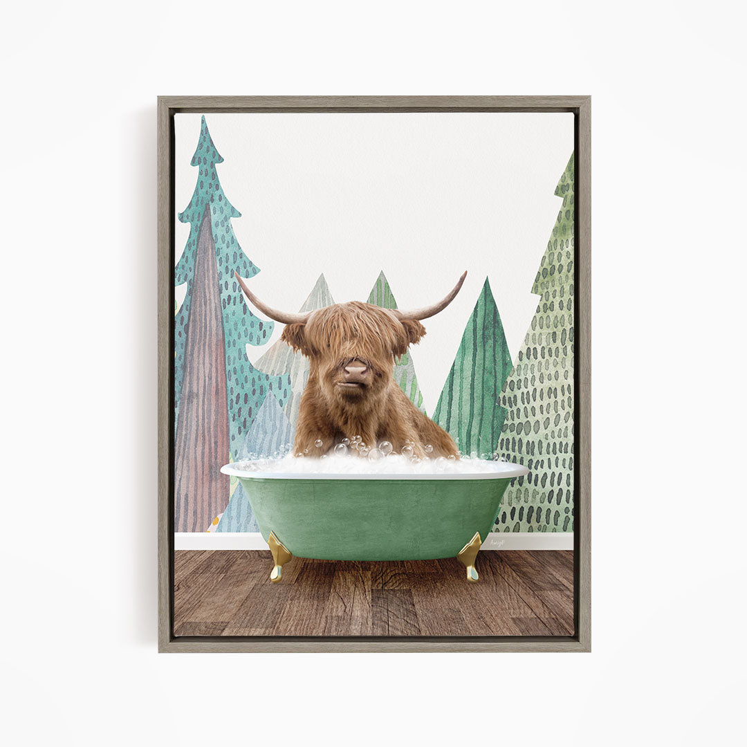 A brown cow with long horns is sitting in a green bathtub, surrounded by a forest scene with trees and a pine tree.