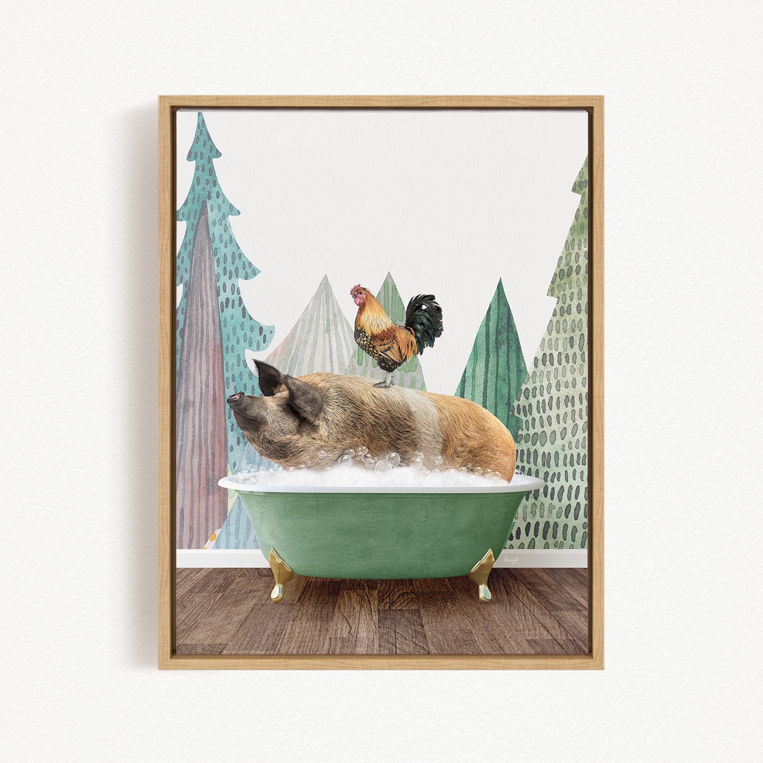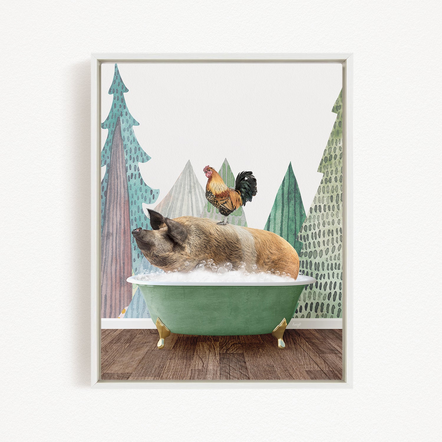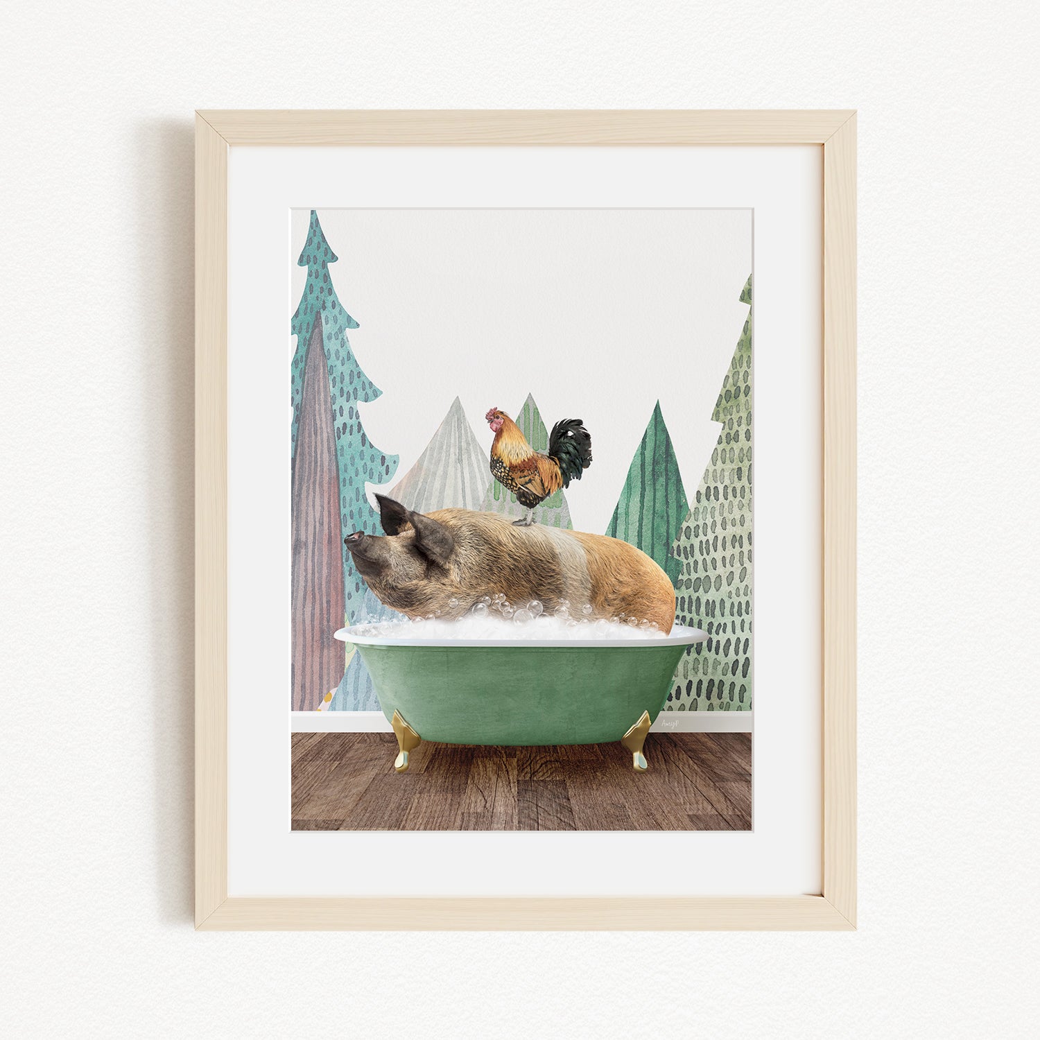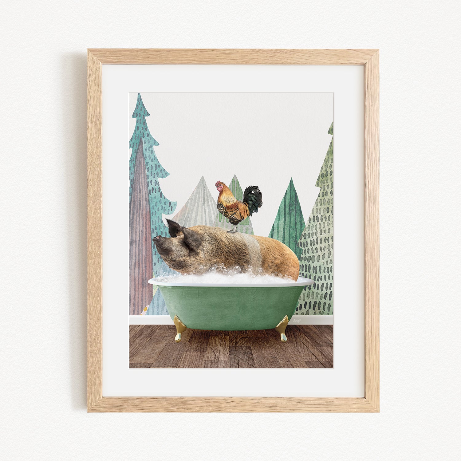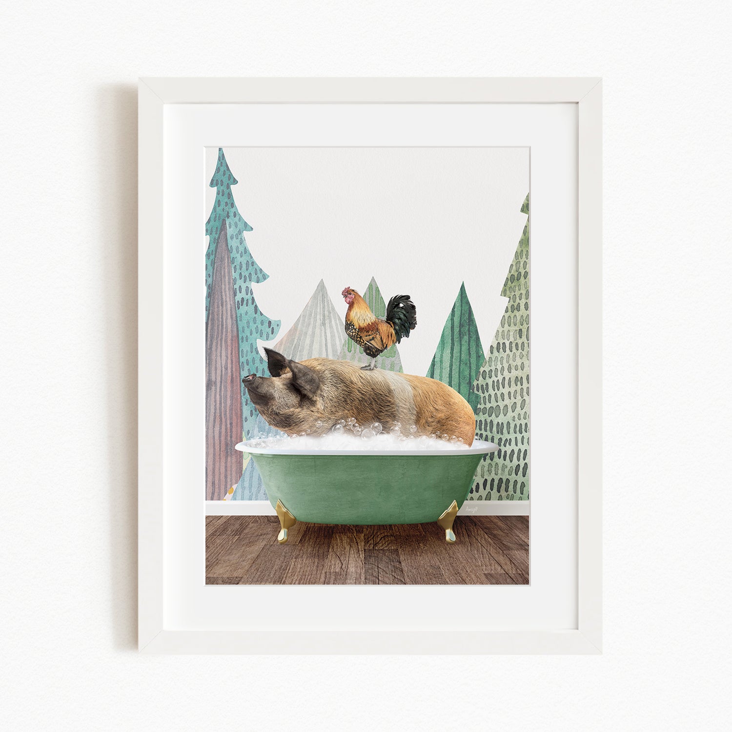 A pig is sitting in a green bathtub, with a rooster perched on its back, against a backdrop of stylized trees and mountains.
