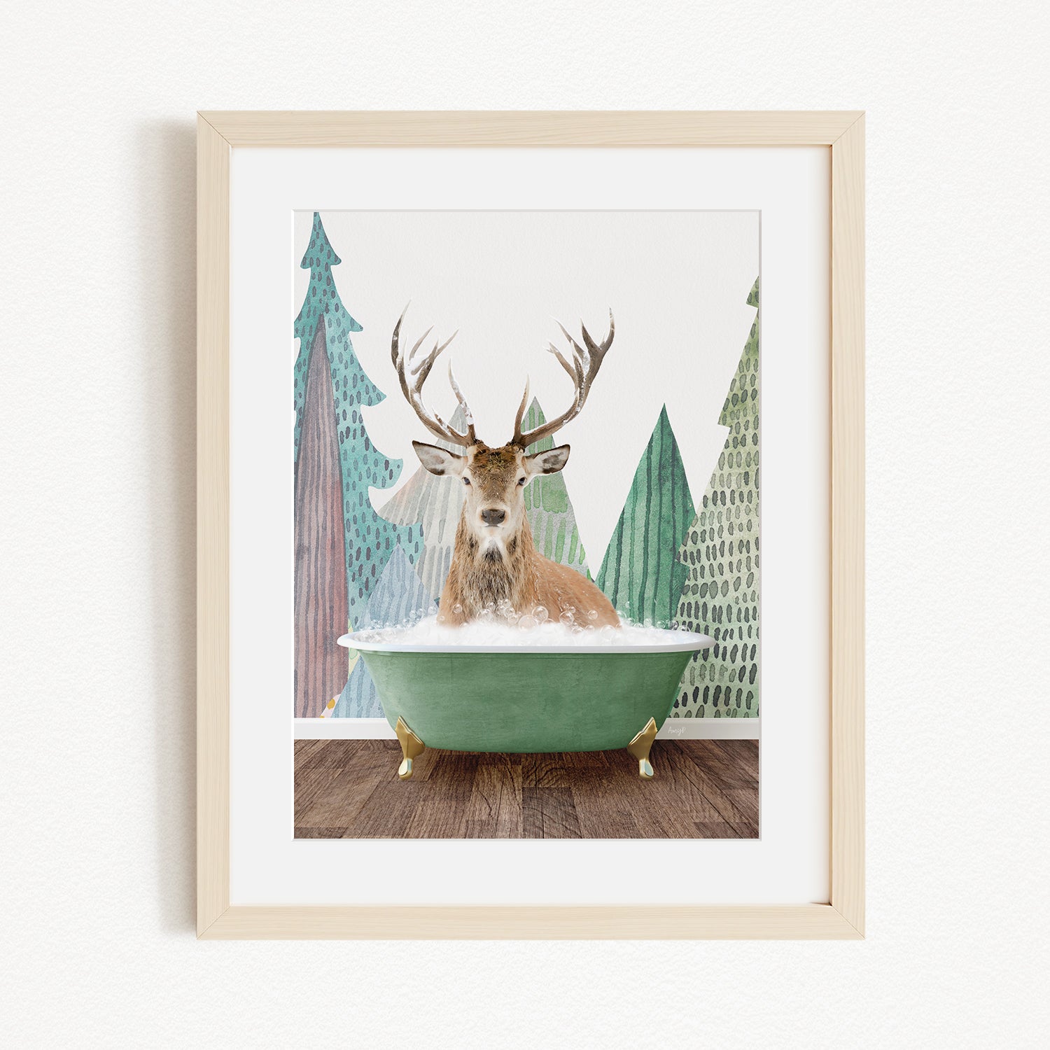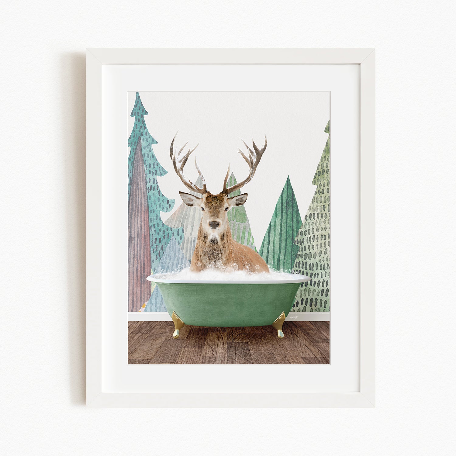 A deer with antlers is sitting in a green bathtub, surrounded by a forest scene with trees and a snowy landscape.