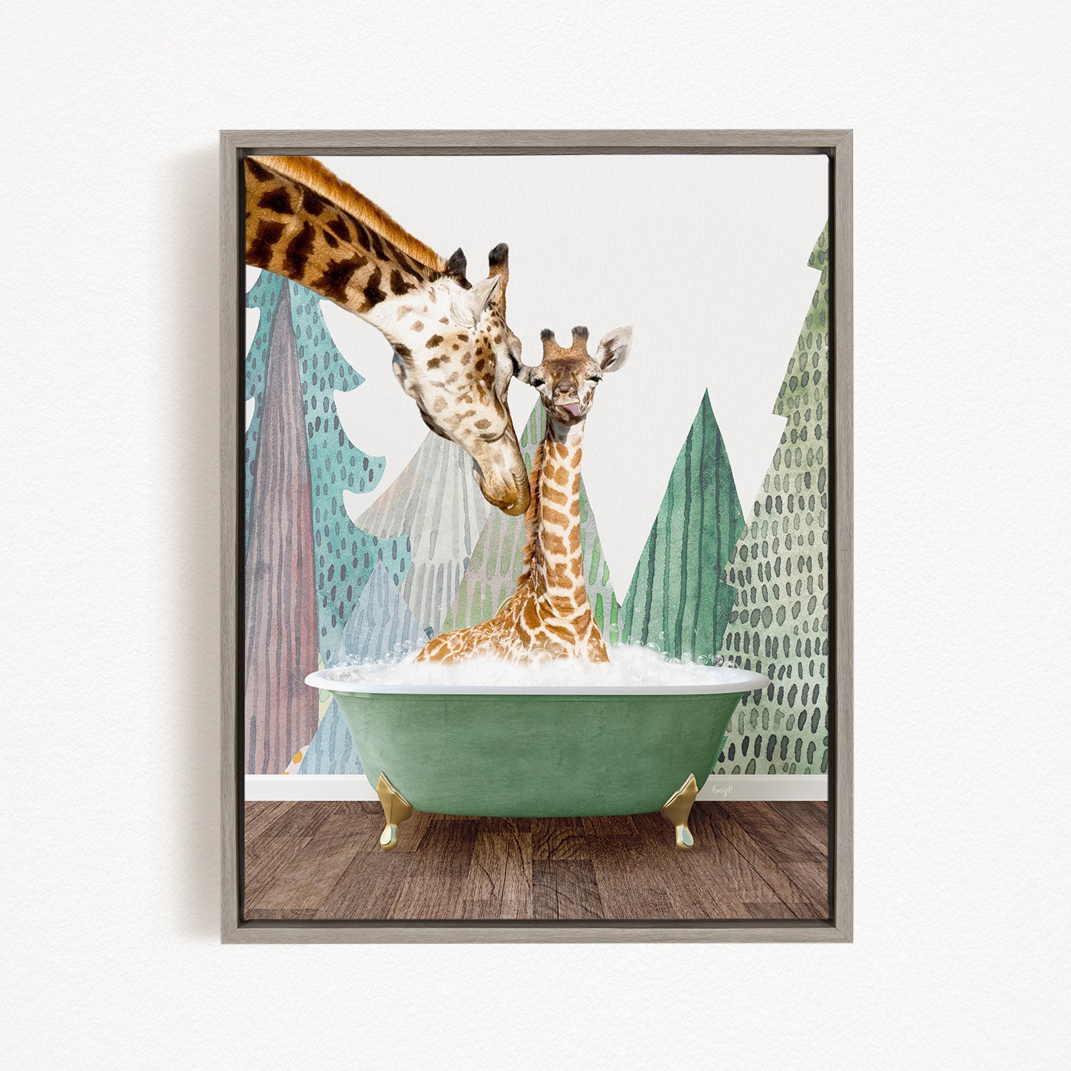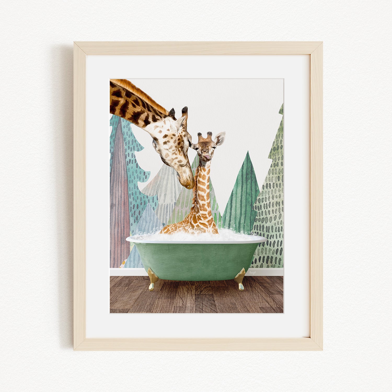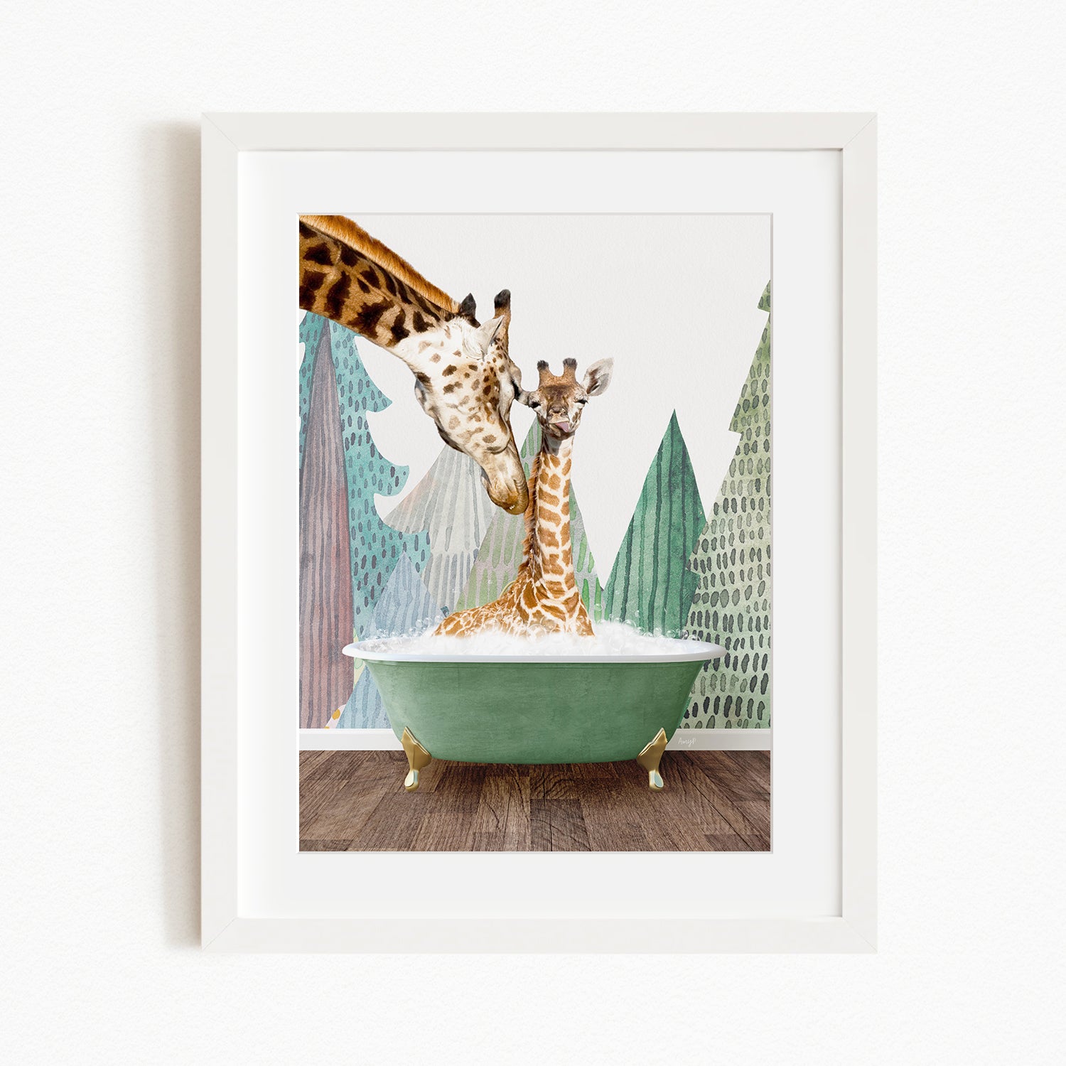 A giraffe and a baby giraffe are sitting in a green bathtub, with a forest-themed background.
