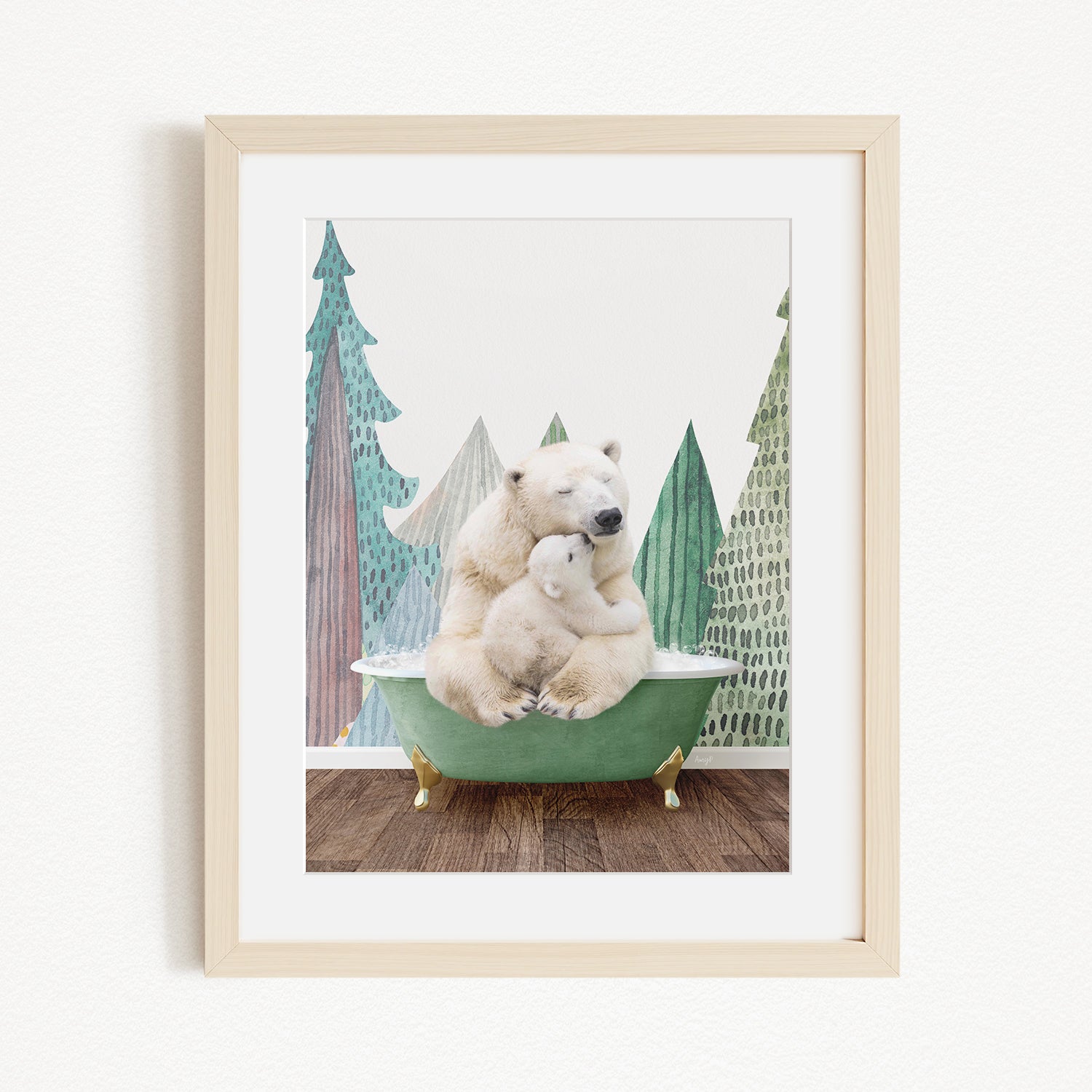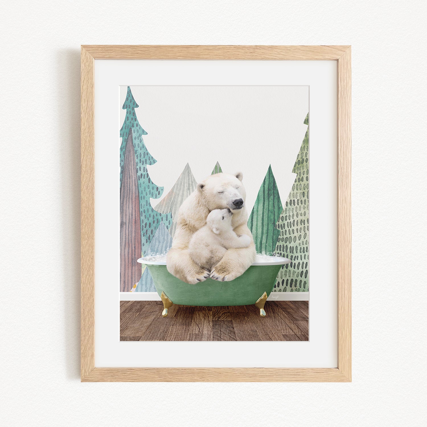 A framed image depicting a mother polar bear sitting in a green bathtub, with her cub resting on her lap, against a backdrop of stylized trees.