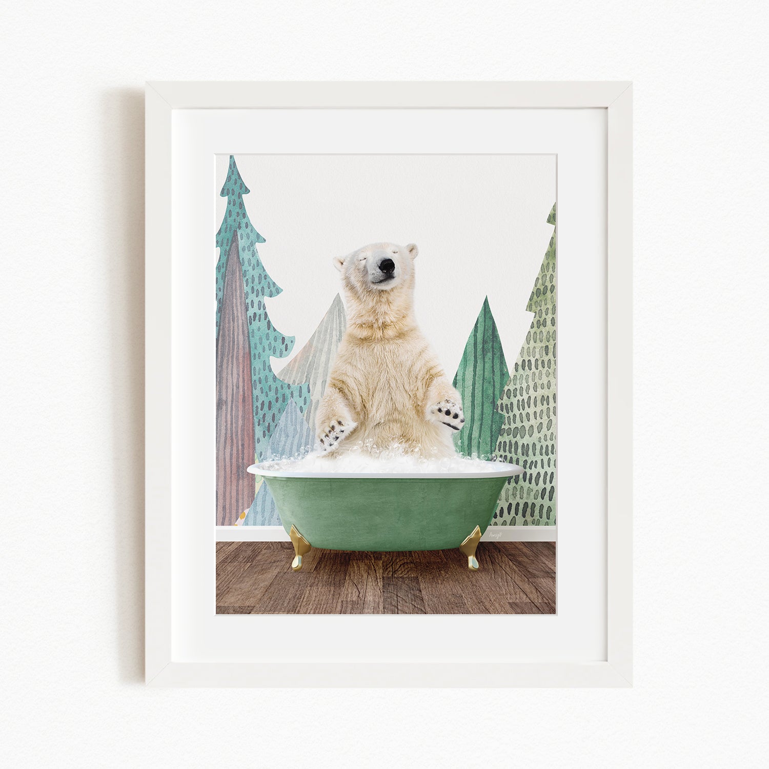 A polar bear is sitting in a green bathtub, surrounded by a forest-themed background.