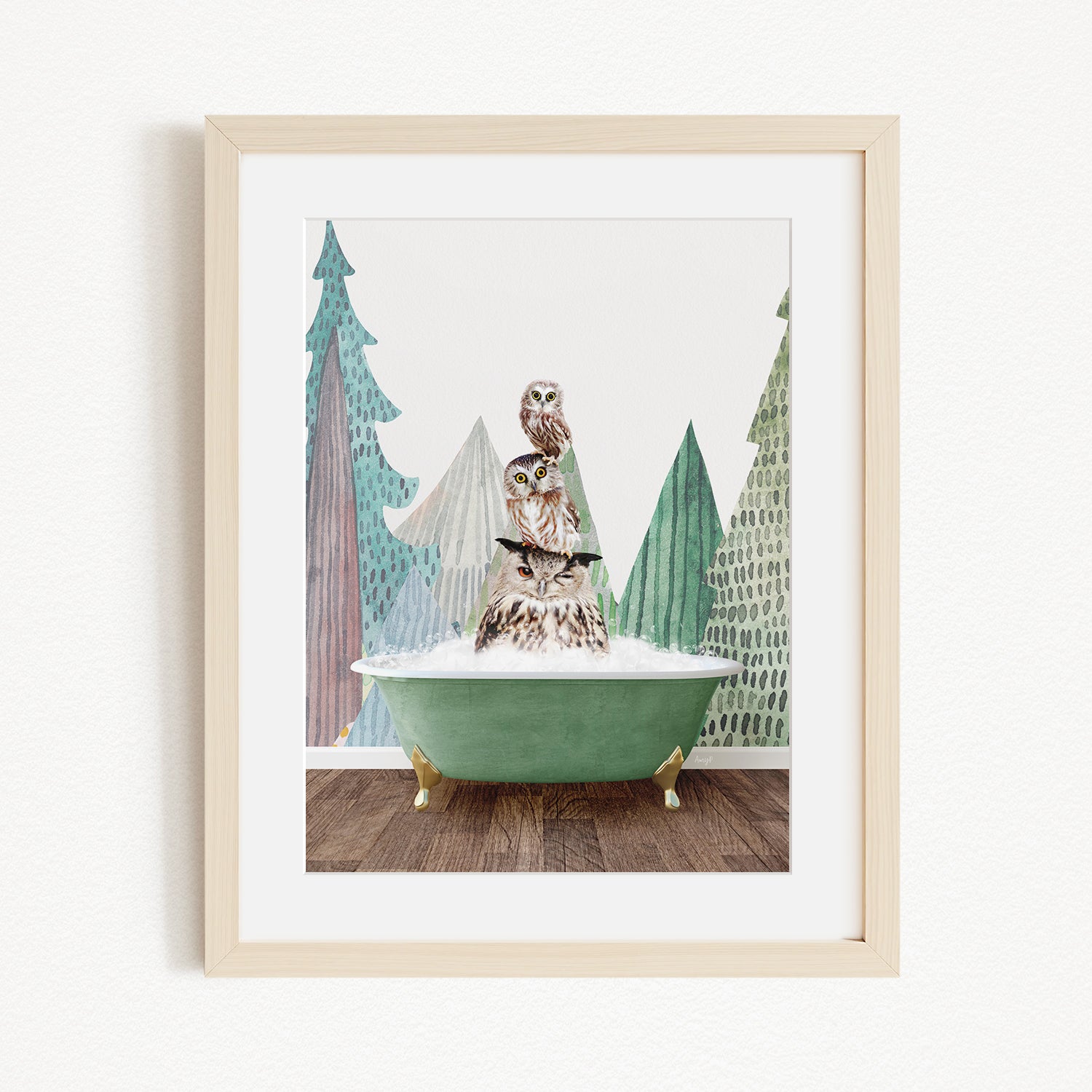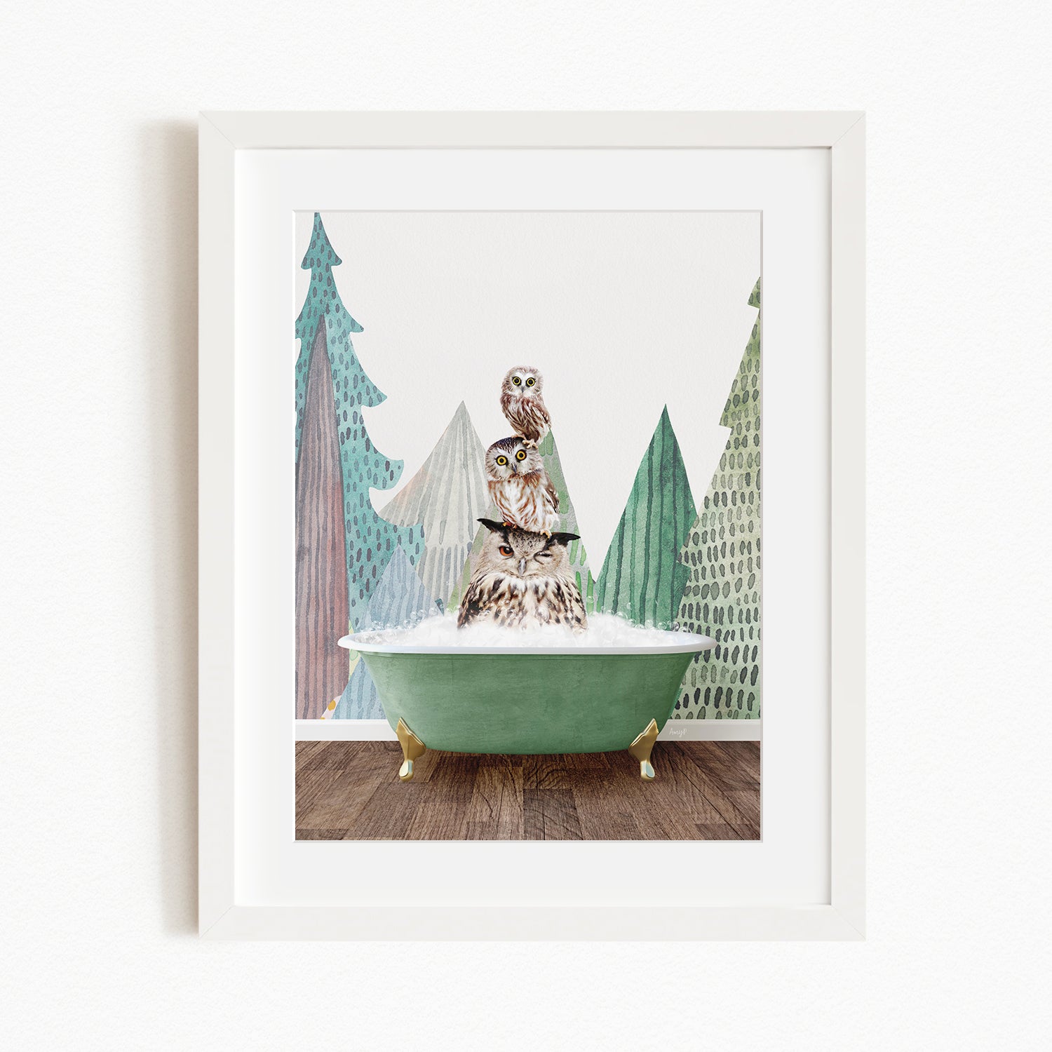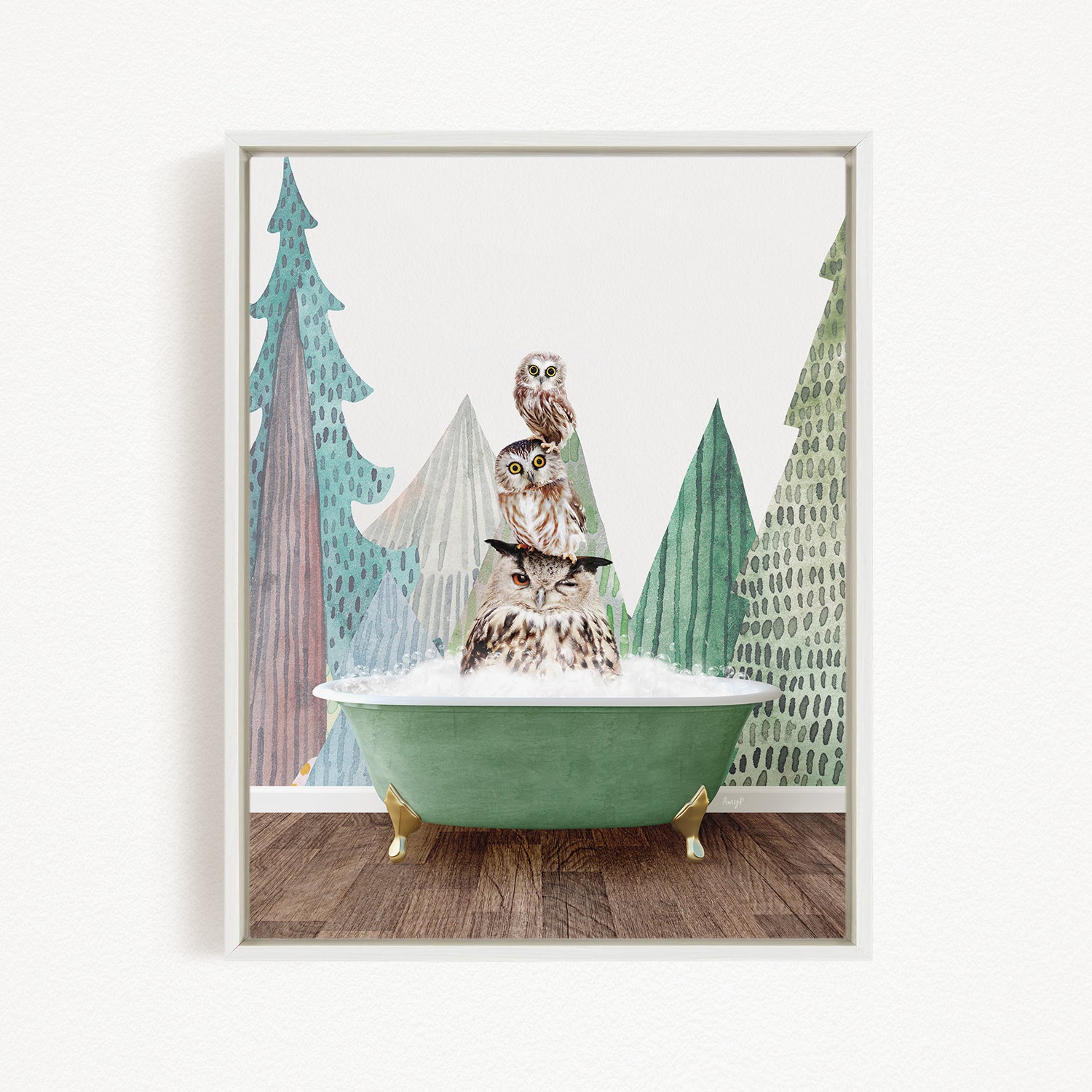 A framed print depicting three owls sitting in a green bathtub, with a forest-themed background.