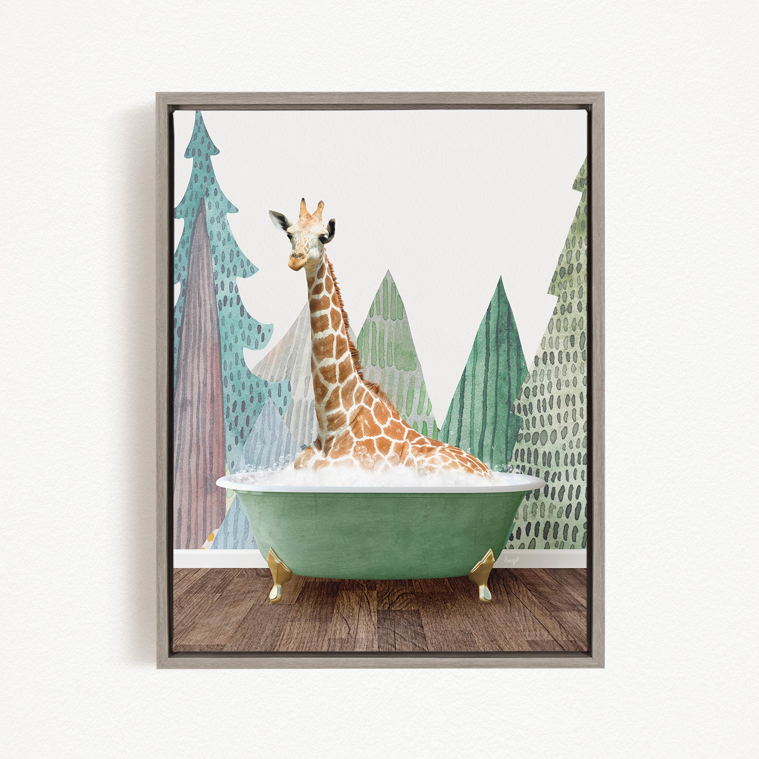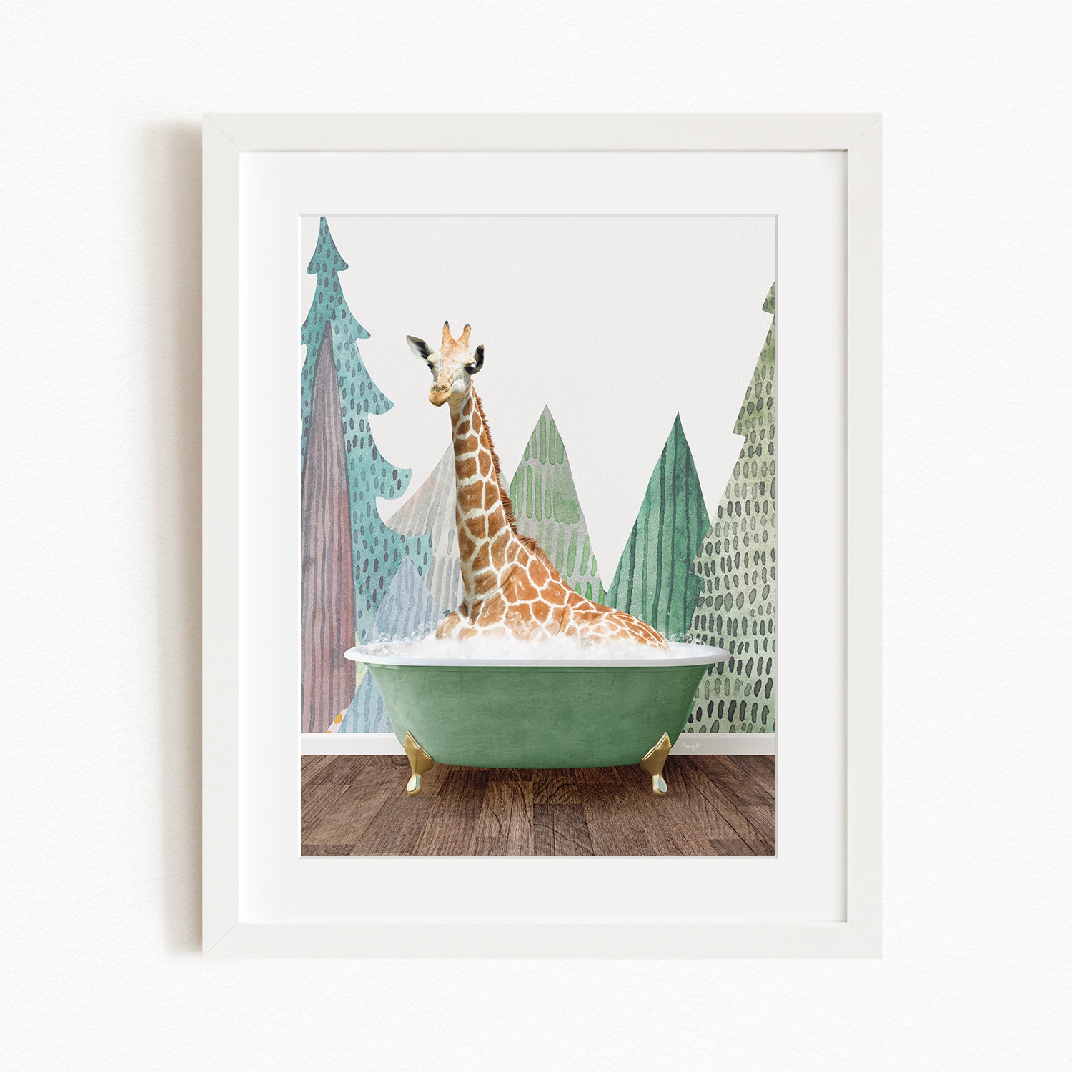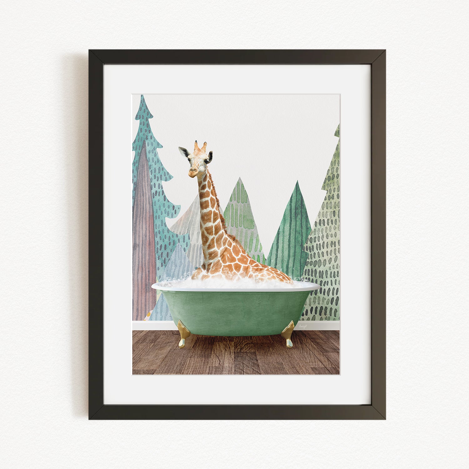 A giraffe is sitting in a green bathtub, surrounded by trees and a forest-like background.