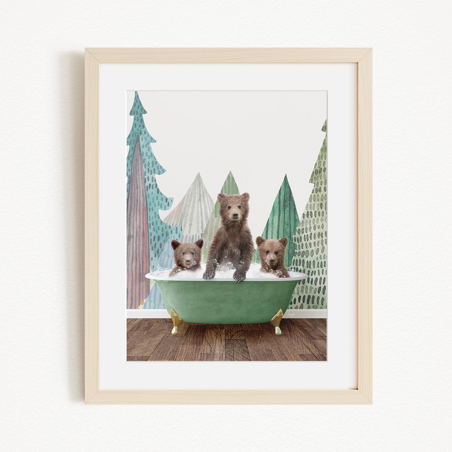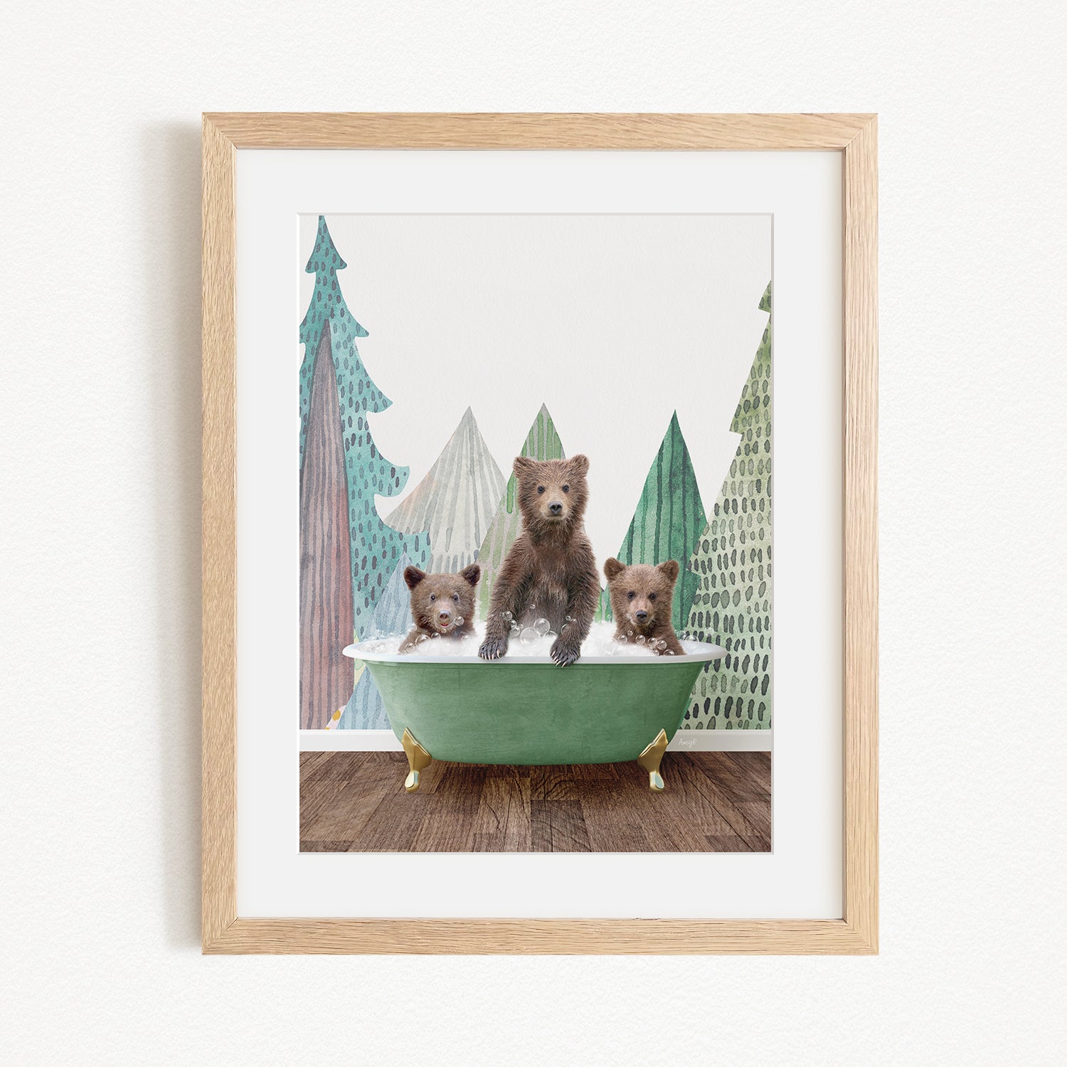 A framed image depicting three bears sitting in a green bathtub, with a forest scene in the background.