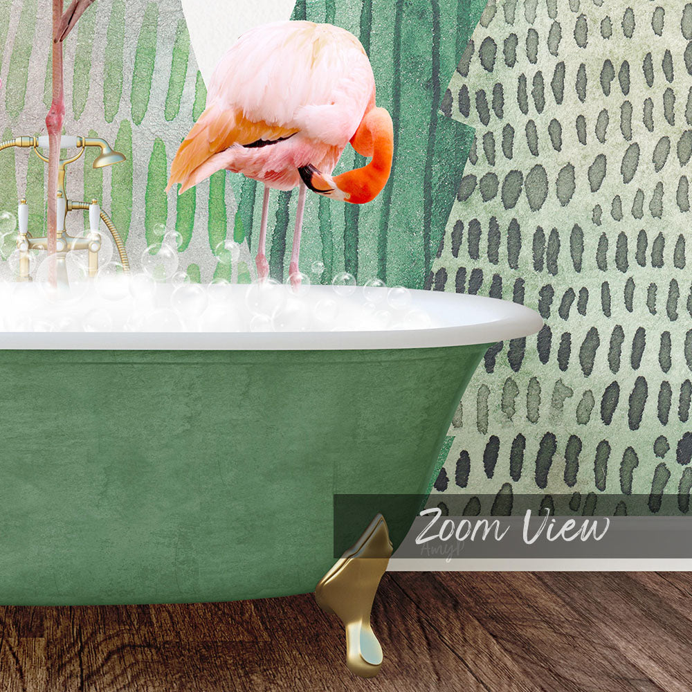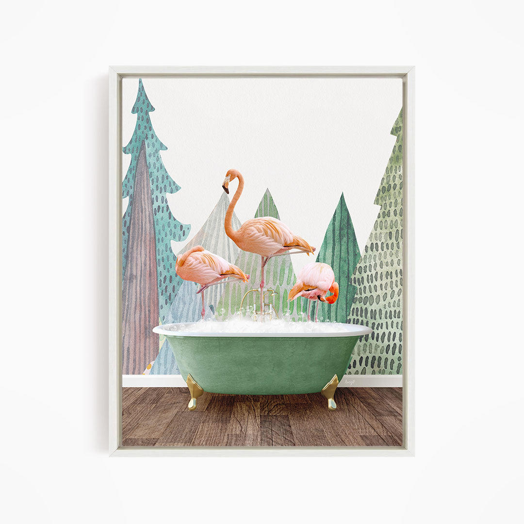 A framed image depicting three pink flamingos standing in a green bathtub, with a forest-themed background.