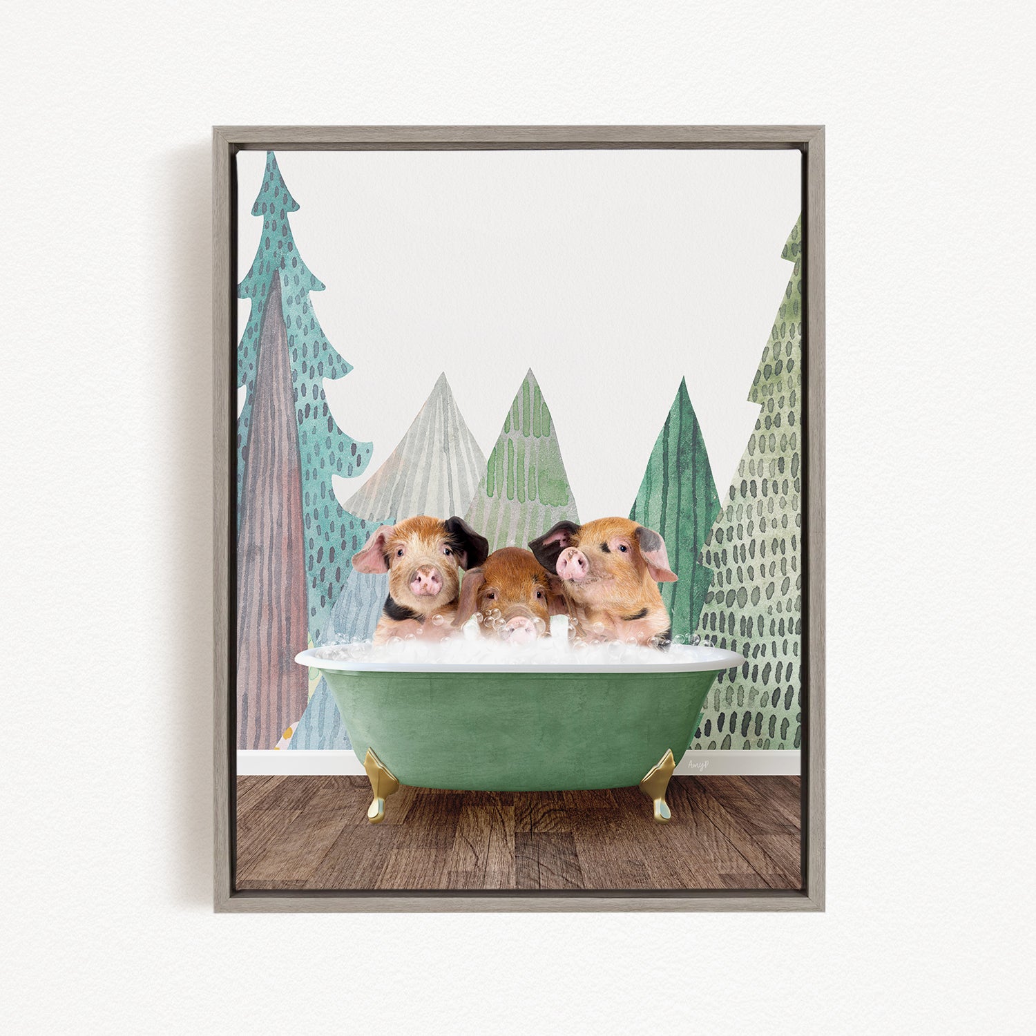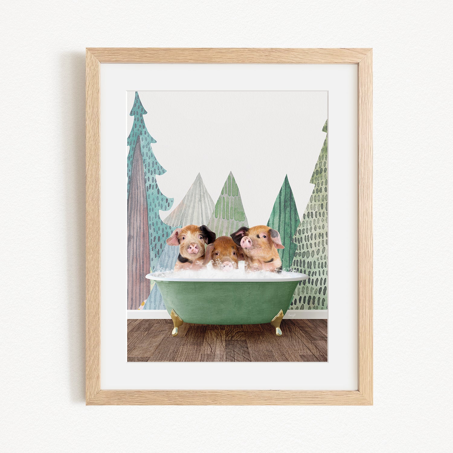 Three adorable pigs sitting in a green bathtub, surrounded by a forest-themed background.